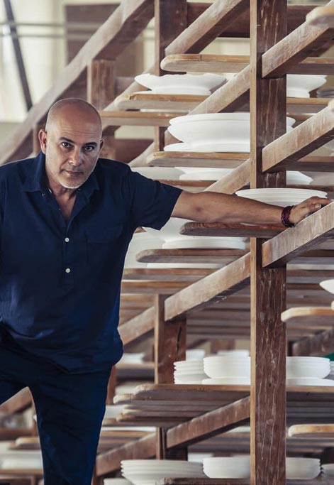 In collaborazione con la celebre manifattura francese di porcellane di Sèvres, Patkin ha realizzato il progetto unico “Ruins for Del Cambio”: 200 piatti “scartati” dalla fabbrica perché leggermente difettosi sono stati personalizzati a mano dall’artista con un richiamo al nome del ristorante e alla sua storia. Il motivo centrale in oro è stato realizzato con tecnica tradizionale su un modello originale del settecento.